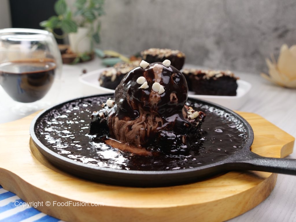 -Heat sizzler pan,place brownie,belgian chocolate ice cream & pour prepared chcoolate sauce.
