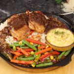 -Garlic fried rice,stir fried vegetables,creamy mashed potato,chicken fillets,garlic & pepper sauce dal ker serve karein!