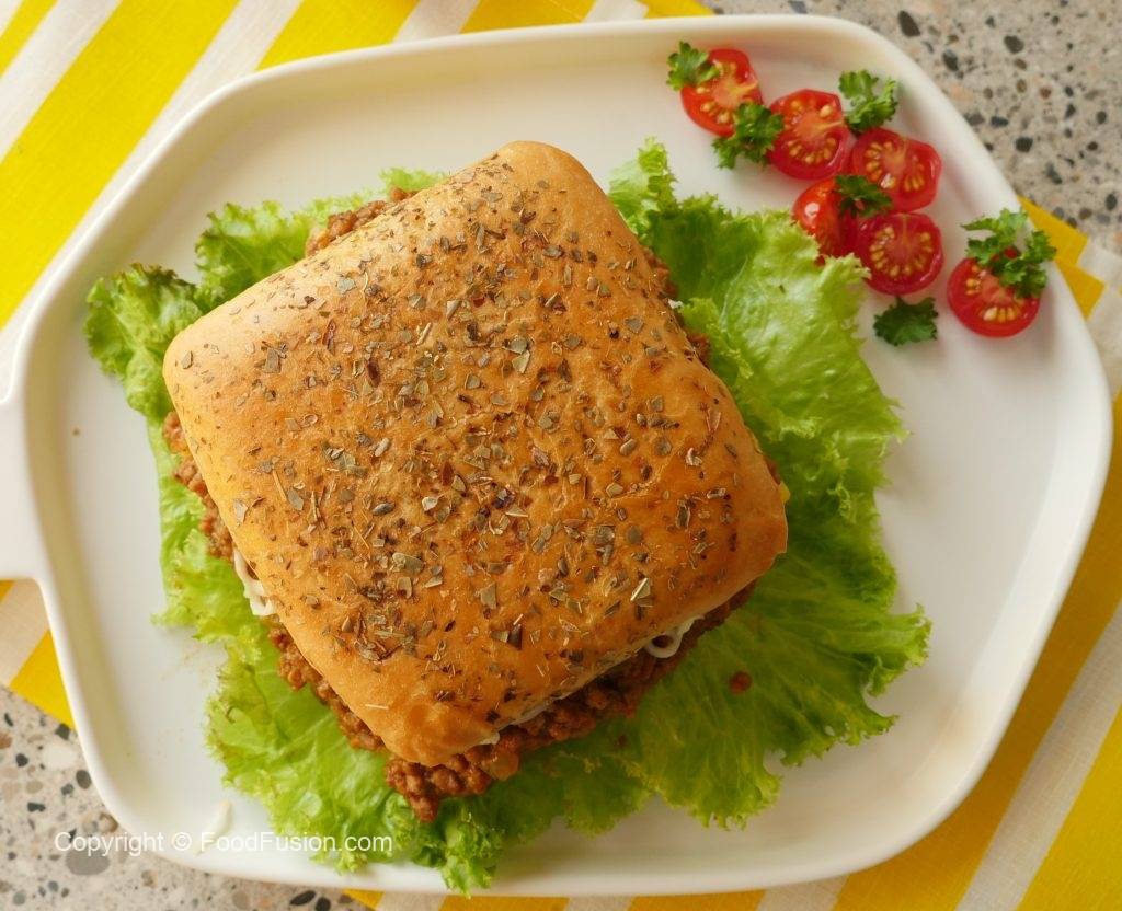 Add cheddar cheese,cooked beef filling,mozzarella cheese and top with another bun (makes 3-4).
