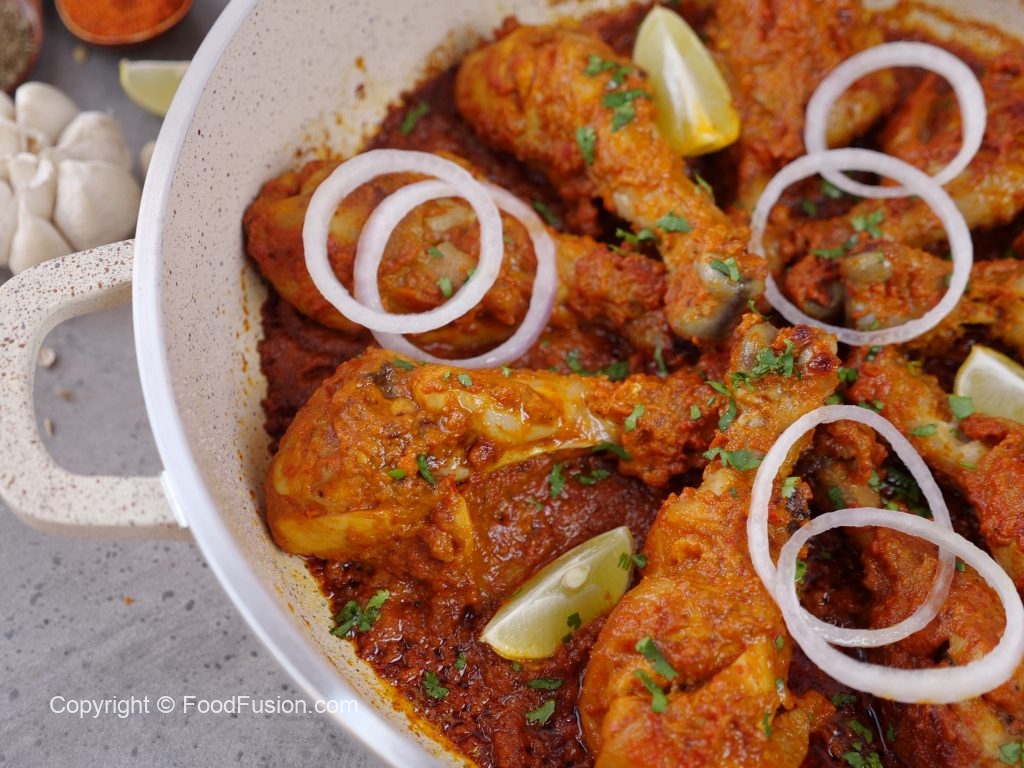 -Karahi mein cooking oil aur marinated drumsticks dal ker remaining marinade laga lein aur dhak ker halki ancch per 12-15 minutes kliya paka lein aur bech bech mein sides ko tturm ker lein aur remaining marinade laga lein ker dhak dein aur halki ancch per gul janay tak paka lein (12-15 minutes).