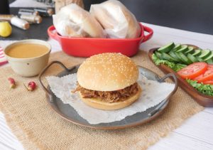 On burger bun,add & spread special mustard sauce,beef mixture,special mustard sauce,tomato and cucumber.