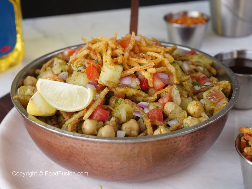 -In a bowl,add chickpeas,potatoes,tomato,onion,prepared chilli chips,spicy green chutney,sweet tamarind chutney,fresh coriander & lemon juice,mix well & serve!