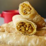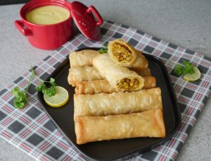 Samosa sheet/manda patti lein aur tayyar filling dal ker tamam sides ko fold ker ka roll ker lein aur maida ka paste laga lein.