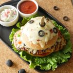 On burger bun,add & spread pizza sauce,place cooked chicken fillet,cheddar cheese,mozzarella cheese, onion,capsicum,tomato,jalapenos,black olives,dried oregano and red chili crushed.