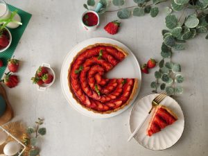 -Tart base per tayyar custard dal ker pheela lein aur 10 minutes kliya refrigerate ker lein.