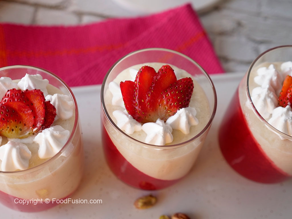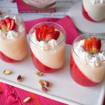 In serving glass,add prepared pistachio kheer enough to cover strawberry jelly and garnish with whipped cream & strawberry slices.
