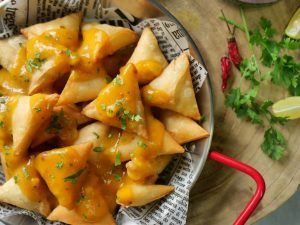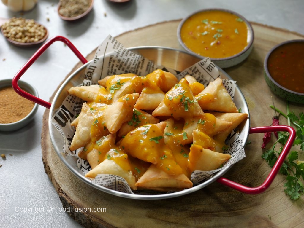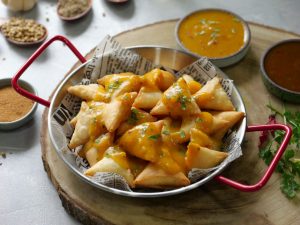 -Cut samosa sheet,make a pocket,add prepared potato filling (1 tsp) & roll into the shape of samosa and seal corners with all-purpose flour slurry & reserve remaining potato mixture for chutney.