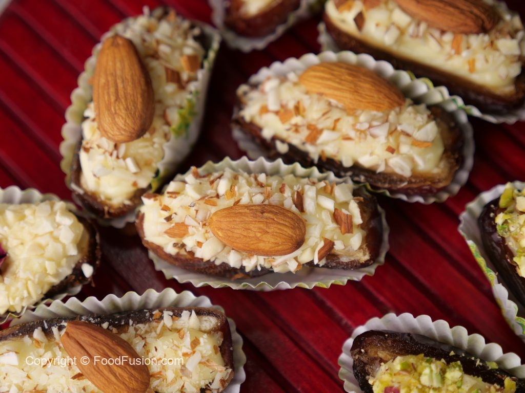 Cut dates in half,deseed them & stuff both parts with prepared creamy stuffing.