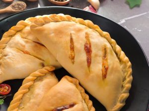 Dough ko ek side per tayyar filling 2 tbs dal dein aur dough ki side ko fold ker ka d-shape bana lein aur fork ki madad sa edges ko seal ker lein (makes 12).