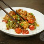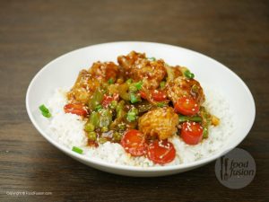 In wok,add oil and garlic (chopped) and sauté little. -Add tomato ketchup,soya sauce,worcestershire sauce,vinegar,brown sugar,red chili crushed,white pepper powder,black pepper crushed,salt and mix well. -Add chicken stock, mix it and bring it to boil. -Dissolve corn flour in water and mix well. -Add corn flour paste in gravy and give it a good mix. -Now add fried vegetables and cauliflower, mix it. -Add sesame oil and mix well. -Garnish with sesame seeds and green onion.
