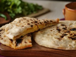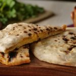 Add prepared potato filling (2-3 tbs), mozzarella cheese (2 tbs), cheddar cheese (2 tbs) and fold all edges to seal the filling.