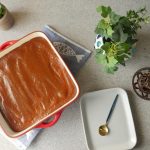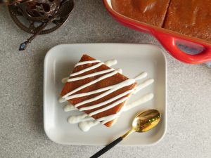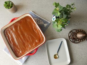 Take out cake from oven,using a skewer poke holes all over the top of the cake.