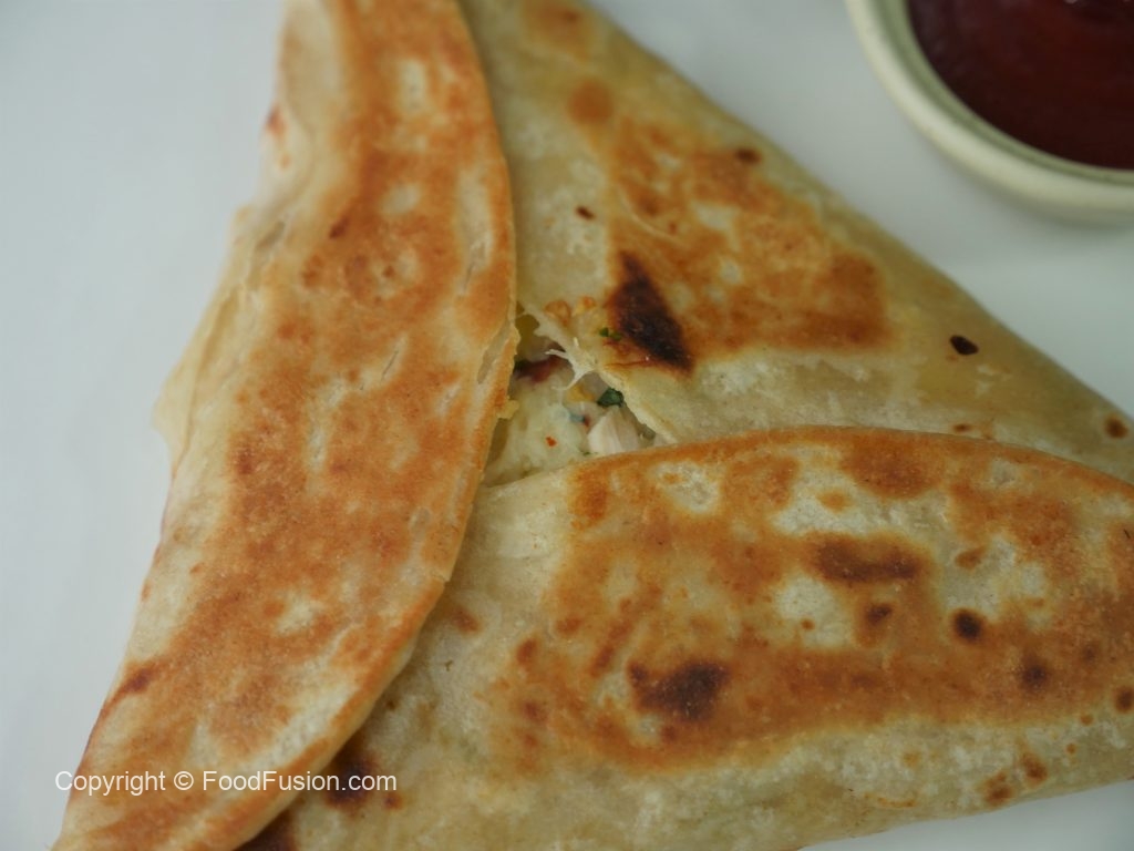 Add cheddar cheese and potato & chicken filling,fold & seal tortillas/roti to make a triangle (makes 6).