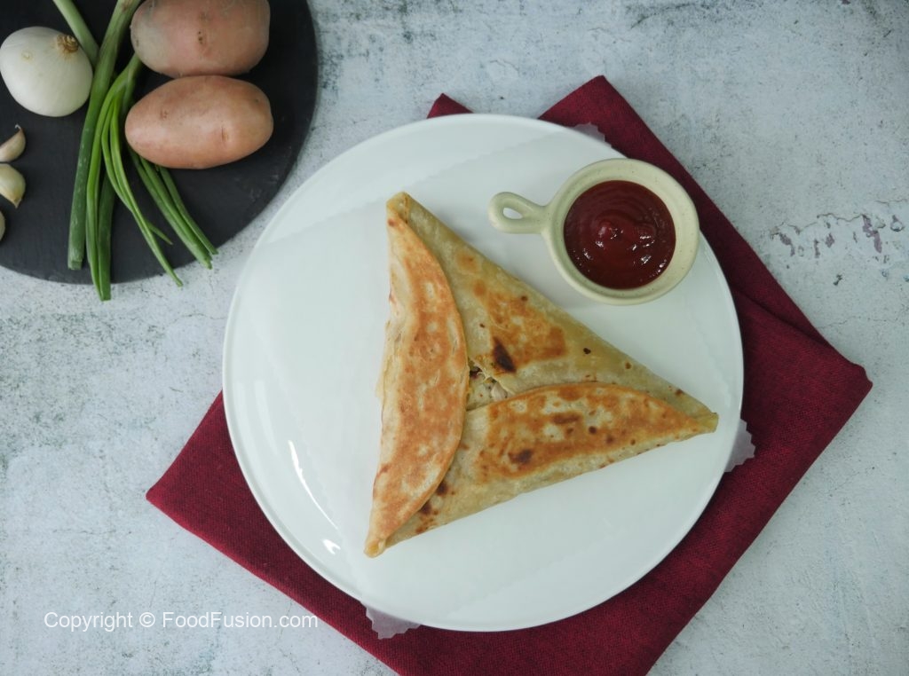 Tortilla ya roti ka upper aloo& chicken filling dal ker triangle shape mein pheela lein.