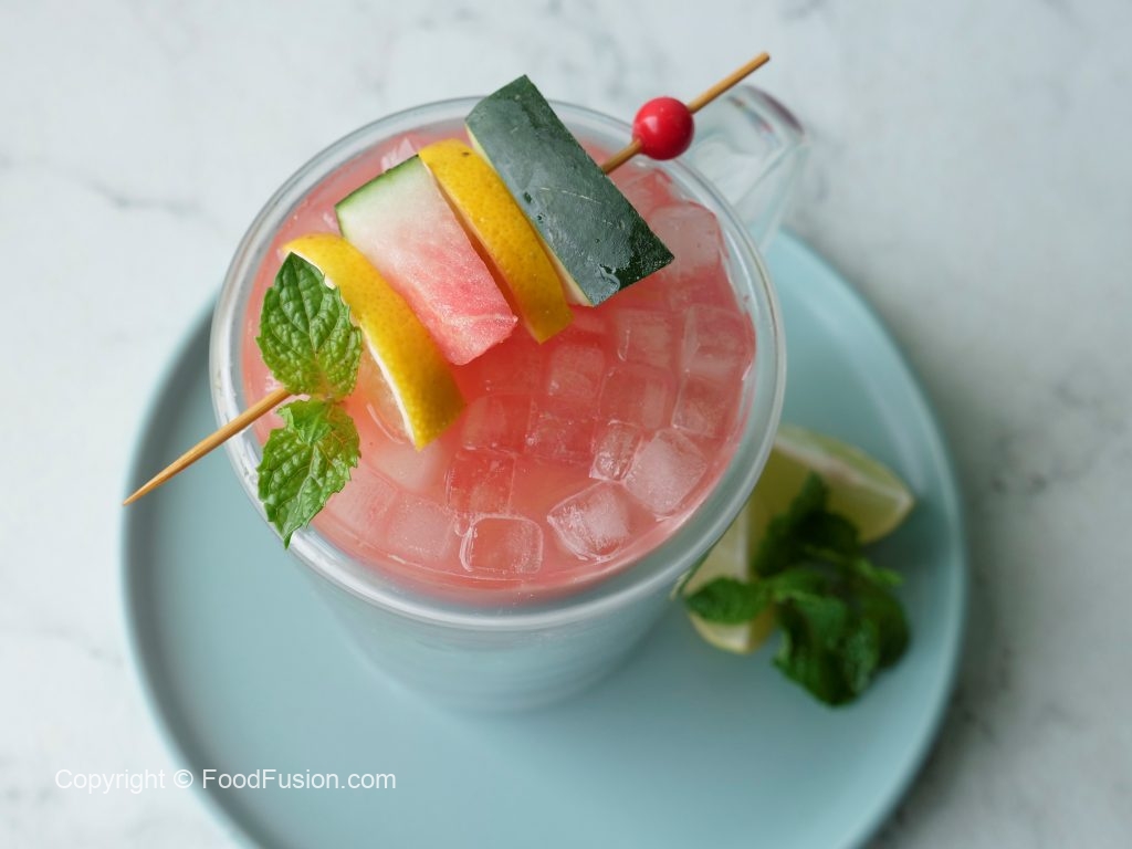 Blender mein watermelon,kheera,lemon juice,shahad aur lemon green tea dal ker ache tarhan blend karein & strain ker lein.