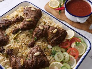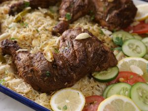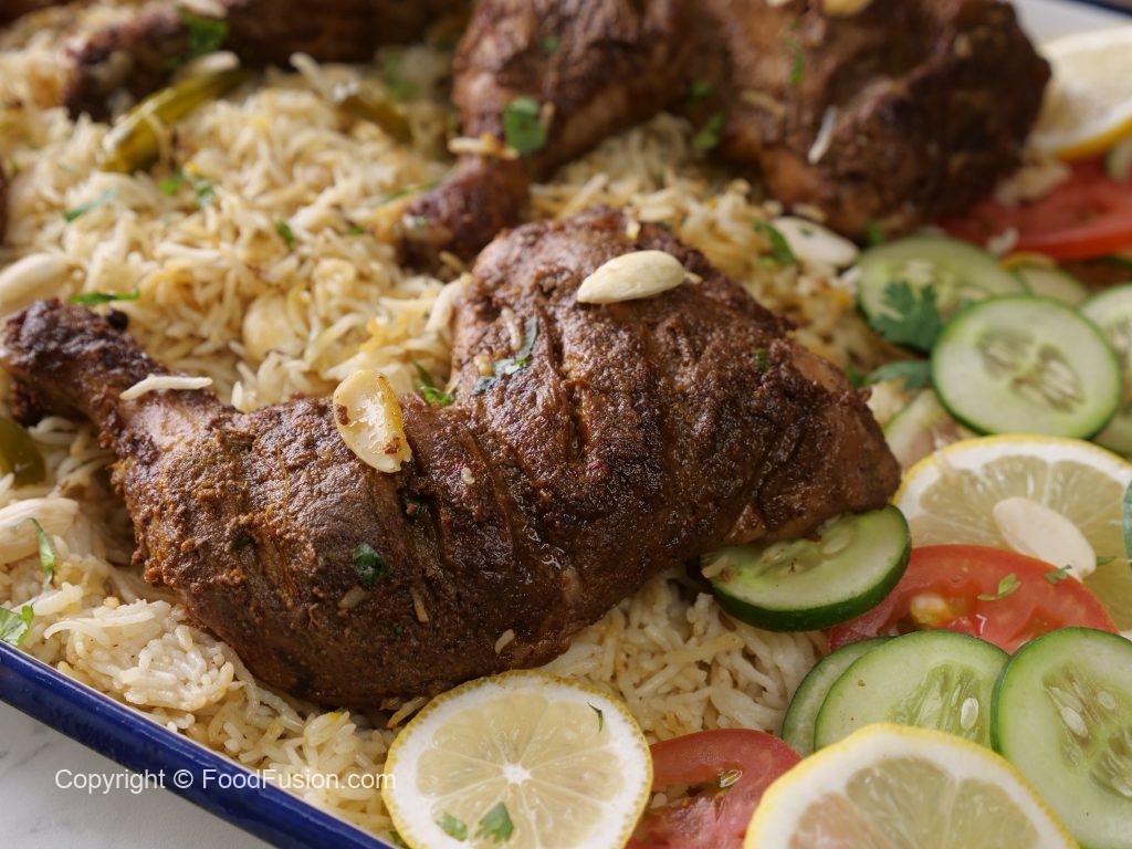 -Garnish with almonds,fresh coriander & serve chicken mandi with mandi rice & sauce!