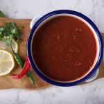 -In a chopper,add tomatoes,green chilli,garlic,fresh coriander,salt,black pepper powder,red chilli crushed,tomato paste & water,chop well & set aside.